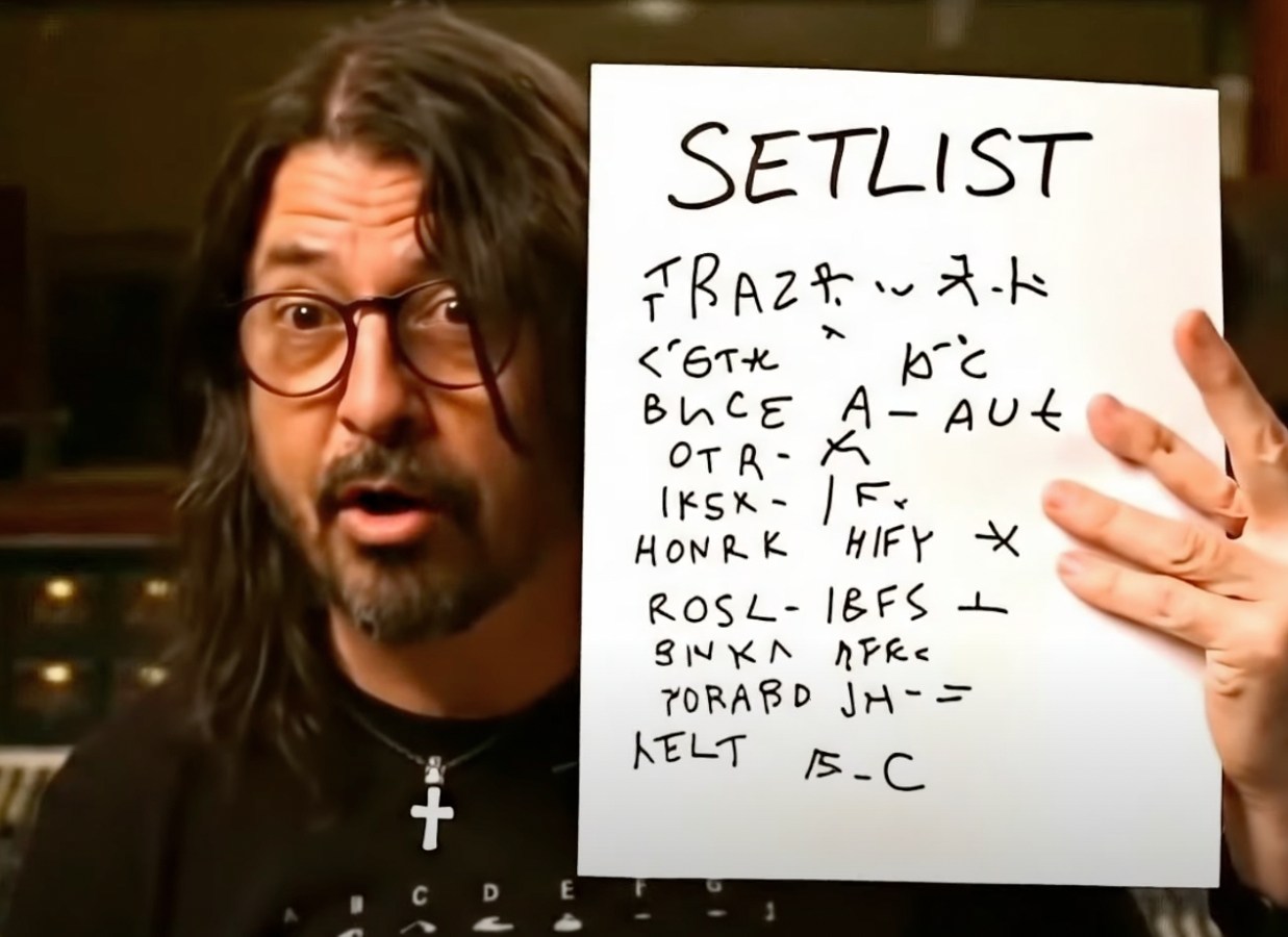 “It’s been a while but I’m happy to announce that Foo Fighters are coming back to bring you that 100 percent real, raw, human element of rock ‘n’ roll,” Dave Grohl says before displaying a fake set list written in AI scrawl.