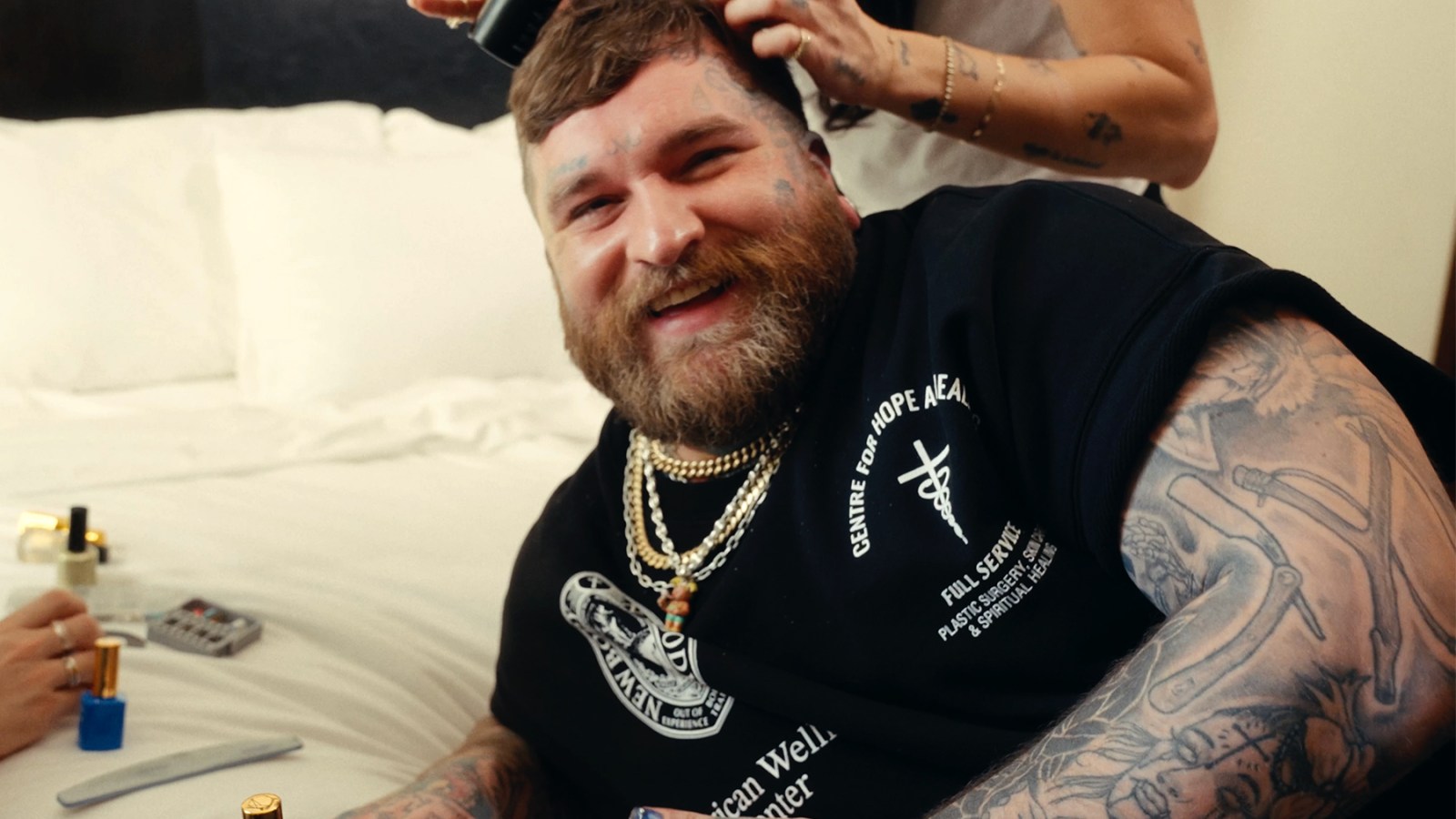 Elsewhere, as Swims got his hair and nails done, he described his styling preferences as “punk rock, but still like baby girl,” before adding with a laugh, “Tough, but sweet, like me. Tough guy, but girly.” He also revealed the music he always turns to when he needs to get hyped for a social gauntlet like the Grammys: Phil Collins’ Tarzan soundtrack.